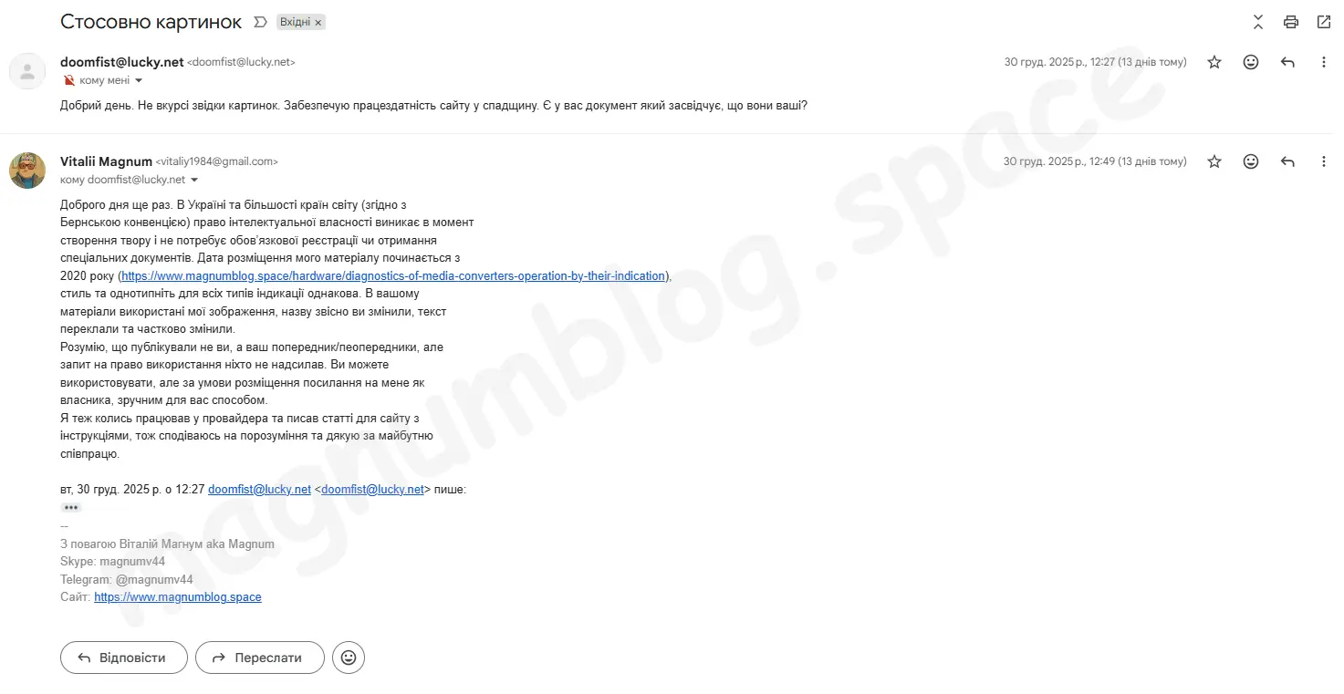 Перше що я зробив, це написав через форму зворотнього зв'язку, звернення, з проханням пояснити їх дії, та вказати в їхньому матеріалі посилання на мою статтю. Бо все ж використали мої матеріали, і навіть ШІ каже, що вони ніби як автор (хоча це лише через домен вернього рівня, та вагу їхнього сайту в пошуковій видачі). Відповідь прийшла десь протягом дня з email адреси Адрес электронной почты защищен от спам-ботов. Для просмотра адреса в браузере должен быть включен Javascript. (досить кумедно, і не дуже професіно, в перекладі doomfist - кулак смерті 😄), з настумним текстом: